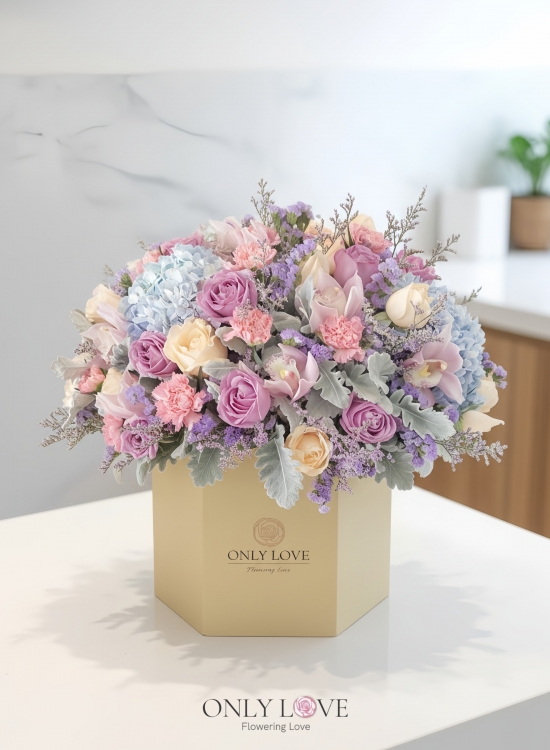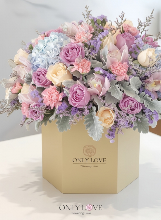 10 Stalks Rose, 10 Stalks Carnation, 1 Stalk Hydrangea, Cymbidium Orchid, Purple Statice, Caspia & Dusty Miller Leaves.