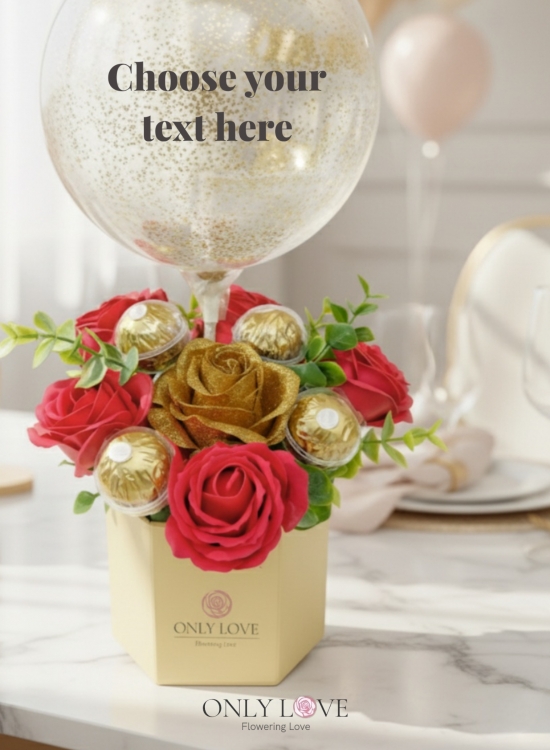5 Stalks Soap Rose, 1 Stalk Artificial Gold Rose, 6 Stalks Ferrero Rocher with Artificial Leaves.