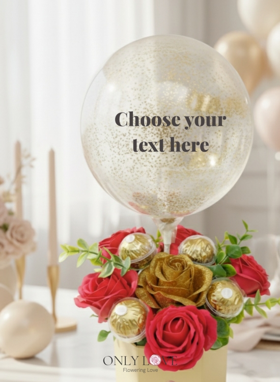 11 Stalks Soap Rose, 1 Stalk Artificial Gold Rose, 12 Stalks Ferrero Rocher with Artificial Leaves.